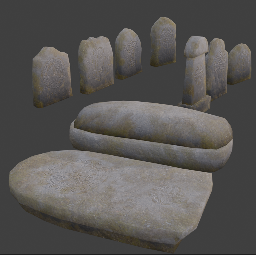 A new cemetery collection has been added, featuring 7 Viking-inspired gravestones with rune inscriptions. Each gravestone comes in two texture variants: with moss and without moss.