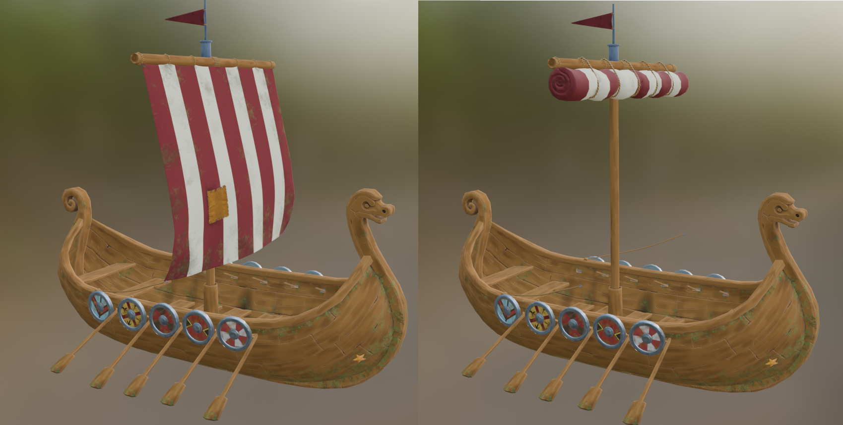 Includes wind shader for sail and flag animations, and oar movement shader for realistic rowing motion.